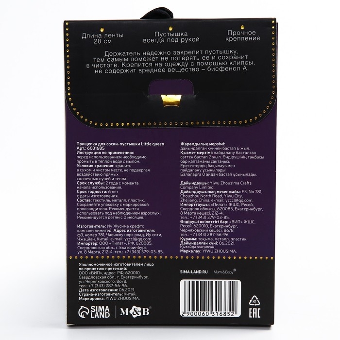 Прищепка для пустышки предотвратит потерю маленького предмета. Используйте специальный держатель, и соска всегда будет под рукой!Изделие фиксируется на одежде ребёнка. На конце цепочки есть карабин, который зацепляется за кольцо пустышки. Надёжное крепление убережёт вещь от падения на пол, если малютка случайно выронит её изо рта.С держателем можно играть, притягательный дизайн точно понравится малышу.Товар изготовлен из качественного нетоксичного материала. Подходит для деток с рождения.
