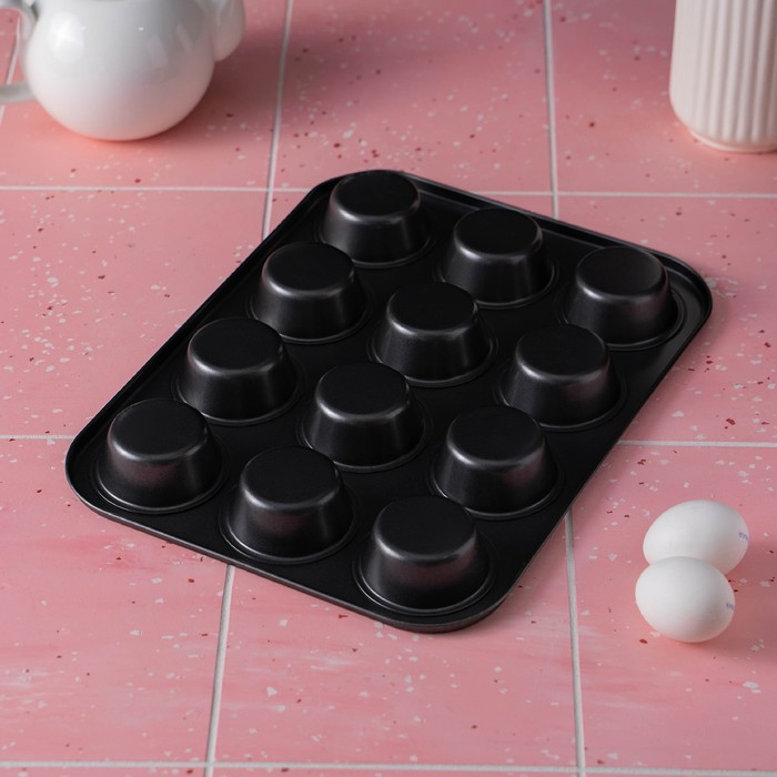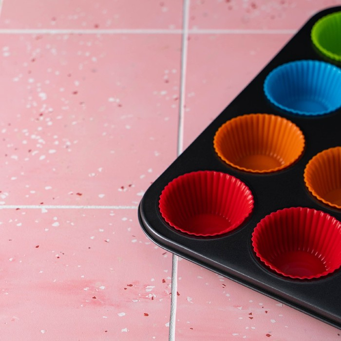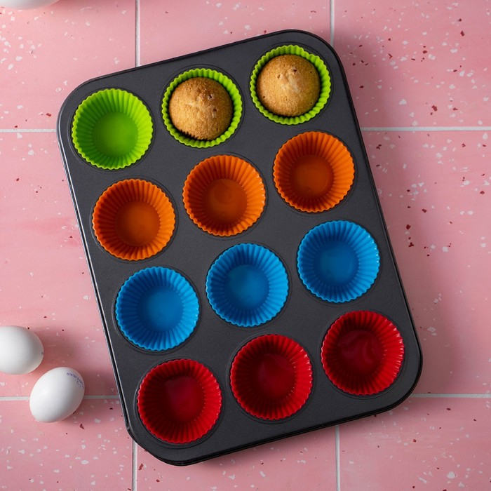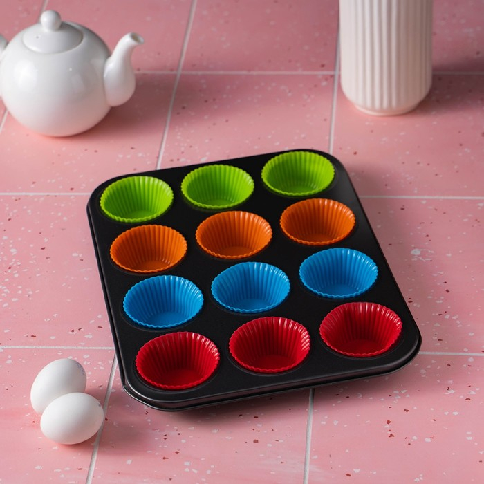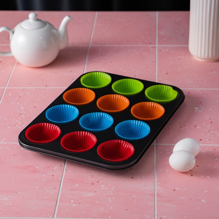 Форма для выпечки Доляна «Силикон плюс», 35×26,5×2,5 см, 12 ячеек, силиконовые вкладки, антипригарное покрытие, цвет формочек МИКС