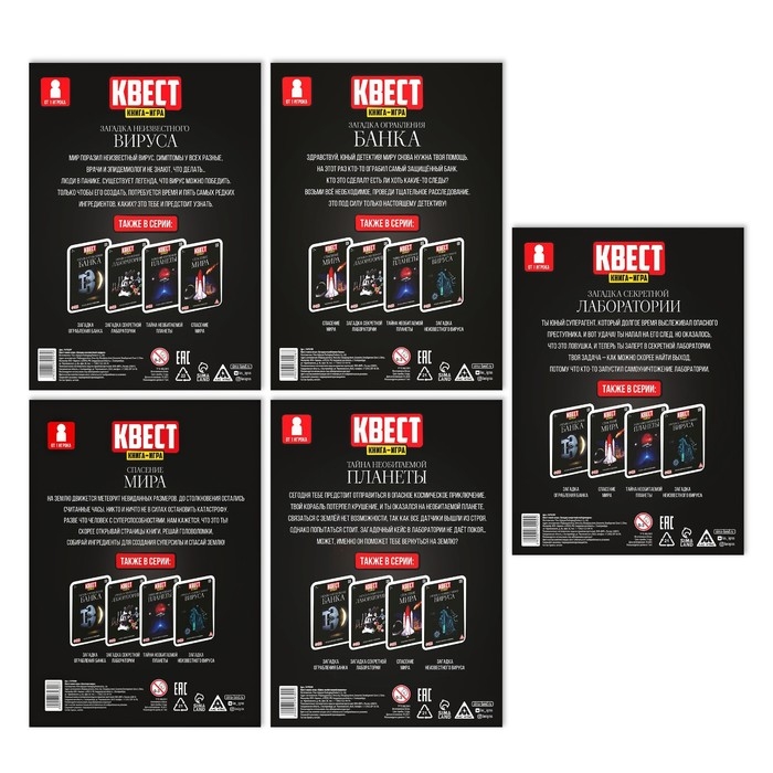 Это издание с определённым сюжетом, где вас ждёт множество загадок, головоломок, шифров и ребусов. Здесь вам предстоит разоблачить преступников, спасти мир, разгадать загадку секретной лаборатории и не только. Это невероятное приключение, которое поможет натренировать логику, смекалку, внимание и способность быстро решать самые сложные головоломки.