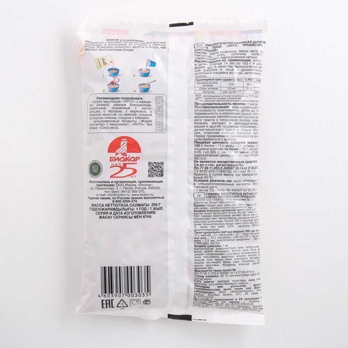 Назначение: взрослым и детям старше 14 лет по 100 г в день во время еды в качестве биологически активной добавки к пище - дополнительного источника пищевых волокон, источника лактулозы. Цельнозерновой продукт «Лито «Пребиотик с лактулозой» — полноценный сбалансированный продукт, обладающий помимо пищевой ценности биологической активностью за счет содержания пищевых волокон (клетчатки) цельного зерна пшеницы и овса, сухой лактулозы и селена. Пребиотики — продукты, способные стимулировать рост и развитие нормальной микрофлоры кишечника. Для усиления этого эффекта желателен совместный прием с кисломолочными продуктами. Сочетание питательных веществ пшеницы и овса, в совокупности со специальной экструзионной обработкой позволило получить уникальный продукт с повышенной биологической ценностью. Применение специальной технологии не только сохраняет от разрушения полезные вещества, содержащиеся в пшенице и овсе, но и увеличивает доступность для переваривания микрофлорой кишечника элементов оболочки зерна. Уникальность продукта состоит еще и в том, что для его изготовления применяется специальный голозерный овес, что позволяет ввести в продукт оболочку овса полностью, т.к. она не теряется при его шелушении. Состав зерна овса характеризуется высоким содержанием водорастворимых пищевых волокон бета-глюканов, способствующих очищению организма от вредных веществ и снижению в крови уровня сахара и холестерина. Введение в состав лактулозы и селена значительно повышает пребиотические свойства продукта. Лактулоза легко растворяется в желудке, но не всасывается в тонком кишечнике, служит пищей для нормальной микрофлоры кишечника. Помимо этого, введение лактулозы позволяет улучшить вкус продукта (сделать умеренно сладким), не приводя к повышению калорийности.