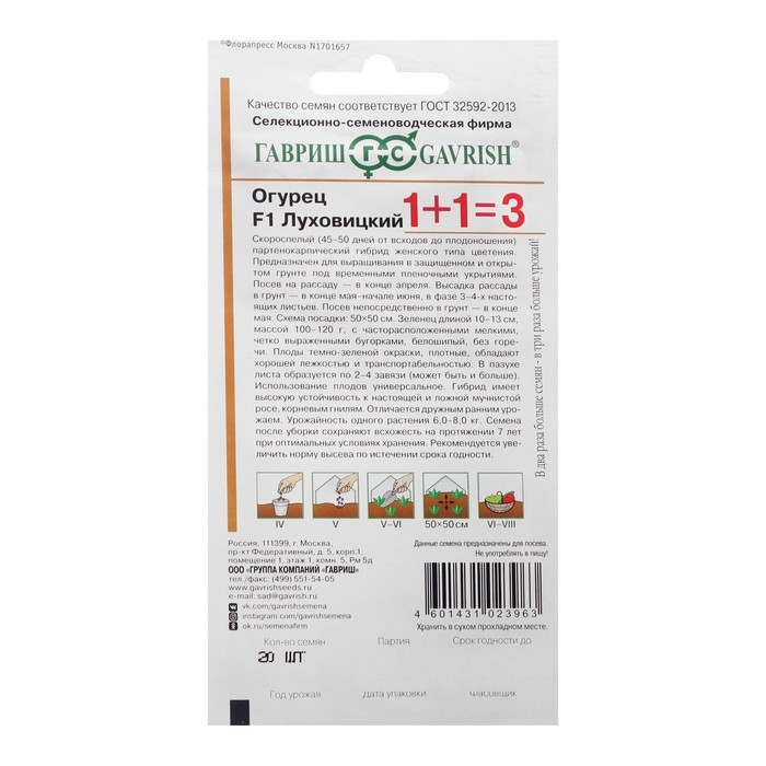 Семена Огурец "Луховицкий F1", серия 1+1, корнишон, 20 шт