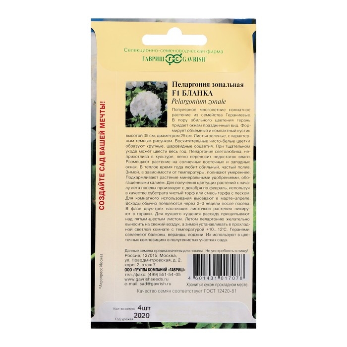 Семена цветов Пеларгония "Бланка ", зональная, F1, 4 шт
