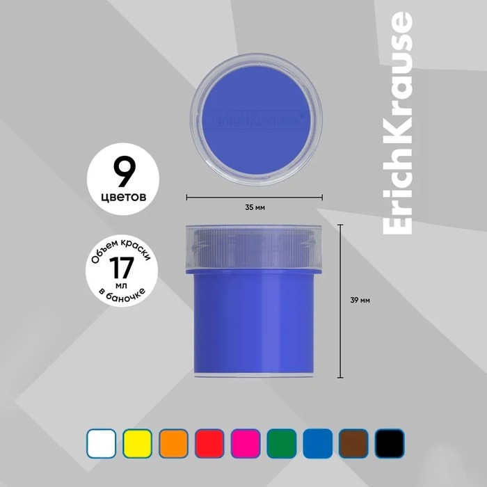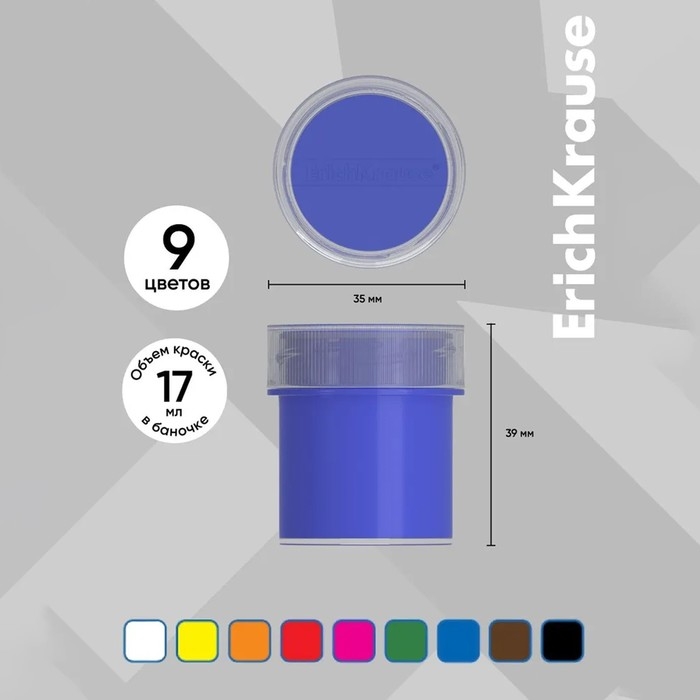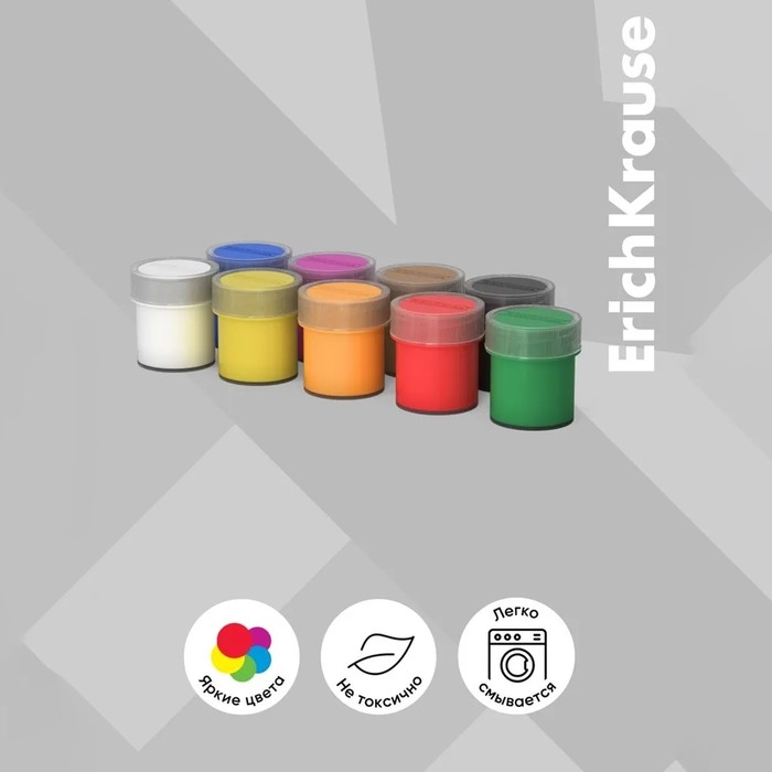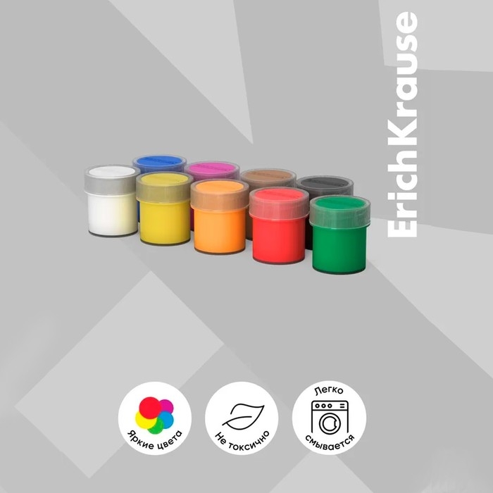 - Безопасная гуашь ErichKrause® на водной основе, легко смывается с рук и отстирывается с большинства видов ткани и бытовых поверхностей, она не токсична, изготавливается из экологичных материалов.