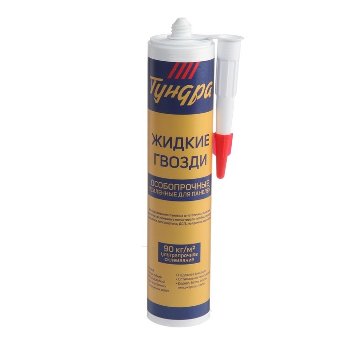 Жидкие гвозди особопрочные марки ТУНДРА предназначены для наклеивания стеновых и потолочных, панелей из вспененного полистирола, пробки, фанеры, обрешётки, гипсокартона, ДСП, молдингов, керамики.