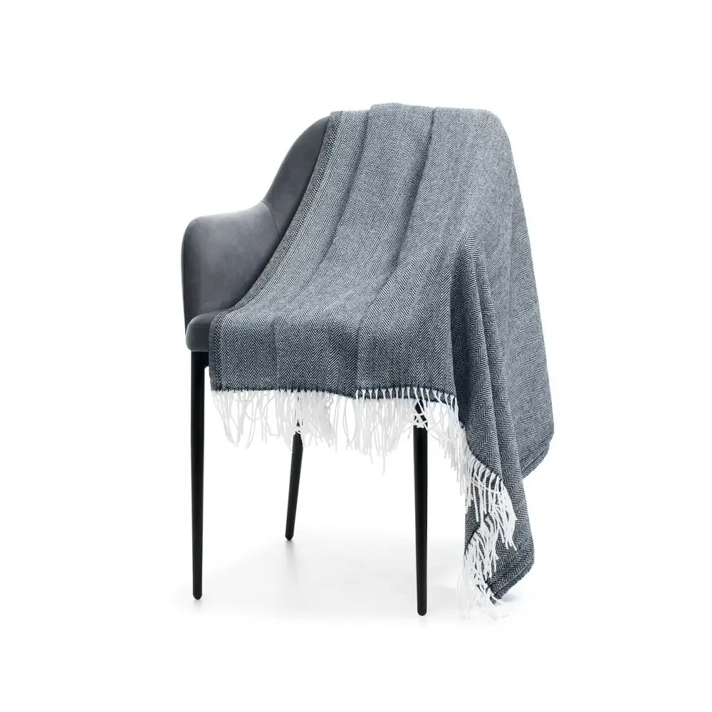 Классический рисунок «елочка» не слишком привлекает внимание, но в то же время добавляет изюминки. Смешанный состав пряжи продлевает срок службы и существенно облегчает уход за пледом.