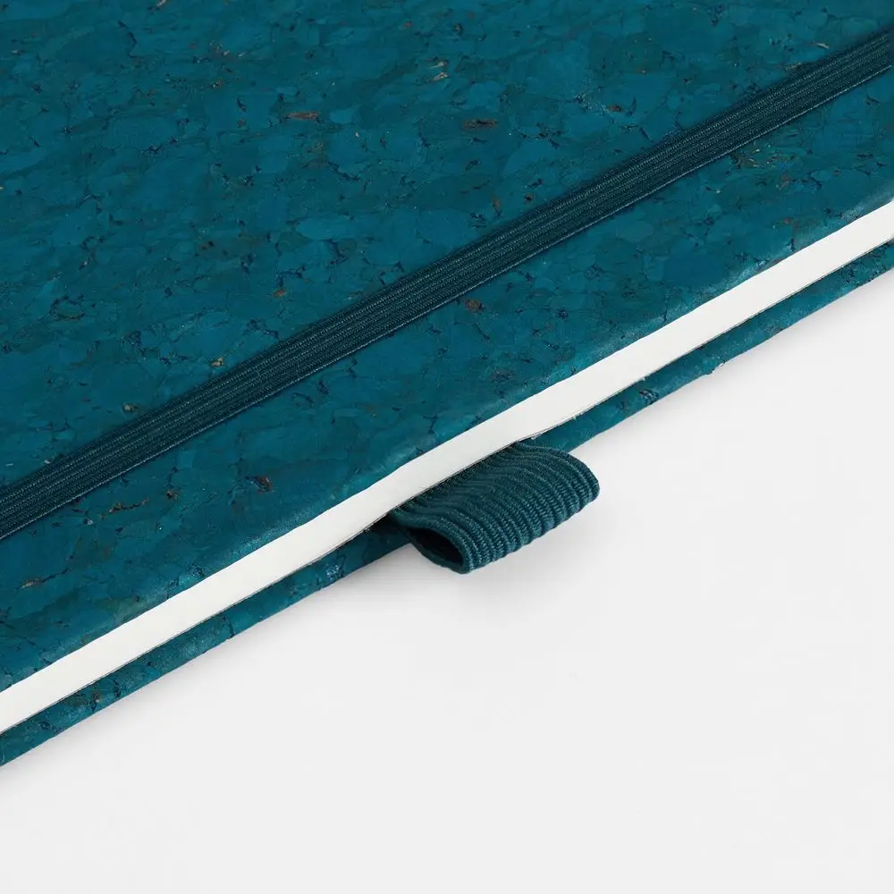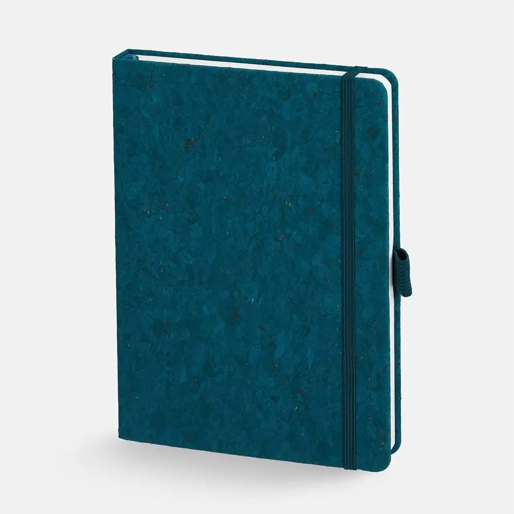 Блокнот с твердой обложкой из из натуральной окрашенной пробки, дополнен петлей-резинкой для ручки, ляссе и резинкой в цвет обложки.