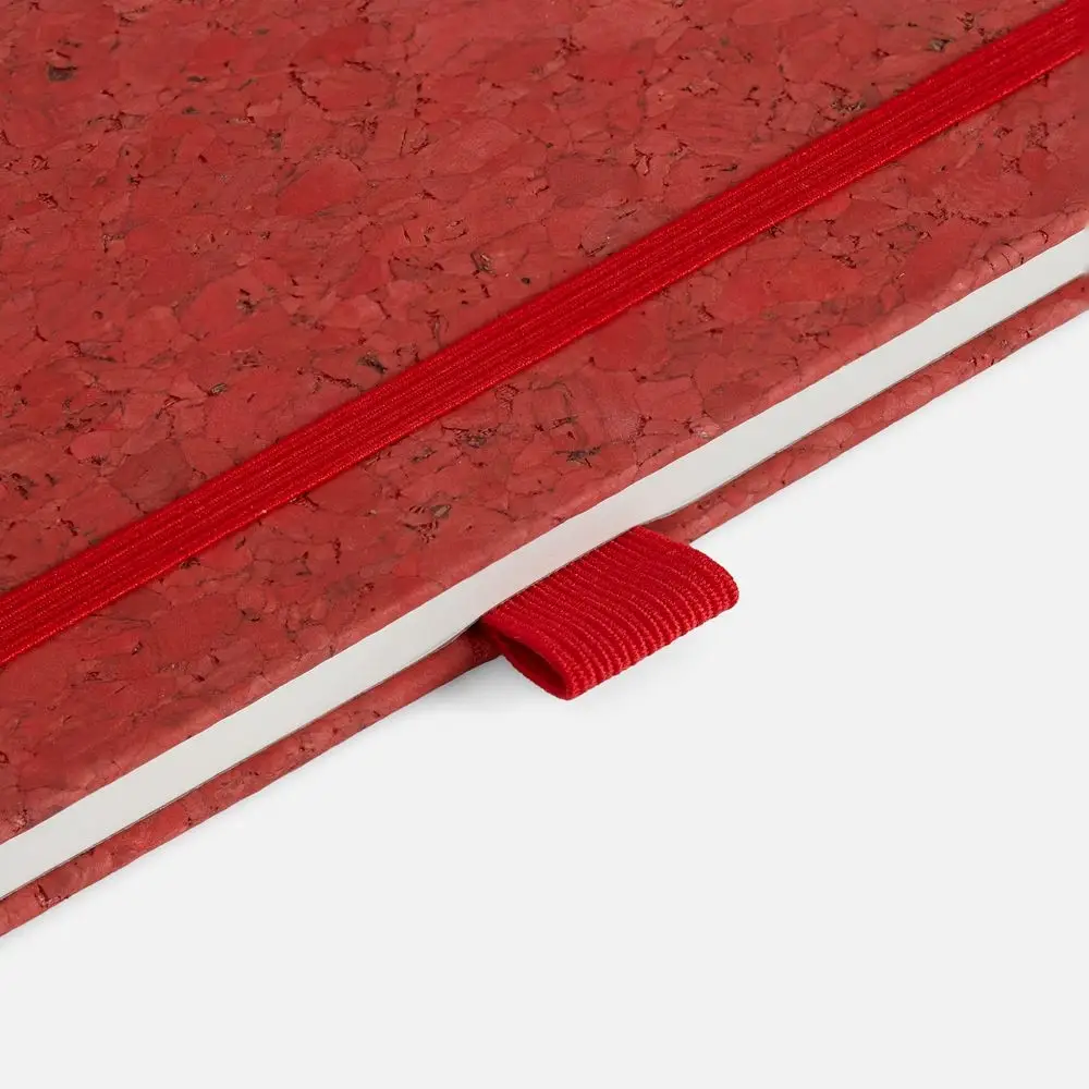 Блокнот с твердой обложкой из из натуральной окрашенной пробки, дополнен петлей-резинкой для ручки, ляссе и резинкой в цвет обложки.