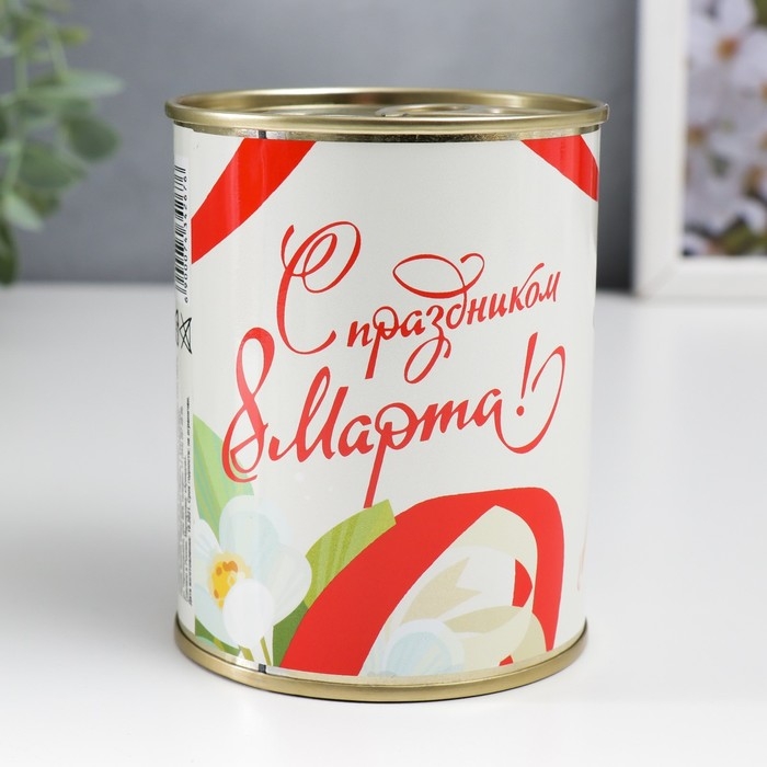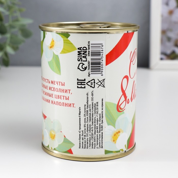 Носки в банке "С праздником 8 марта!" (внутри носки женские, цвет белый)