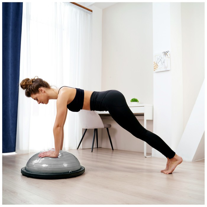 - Планка с притягиванием колена к груди. Полусферу нужно перевернуть плоской стороной вверх, затем встать в планку, обе руки на краю сферы с противоположных сторон. Как только получится удерживать равновесие, нужно притянуть колено одной ноги к груди по диагонали, а после сменить ногу.