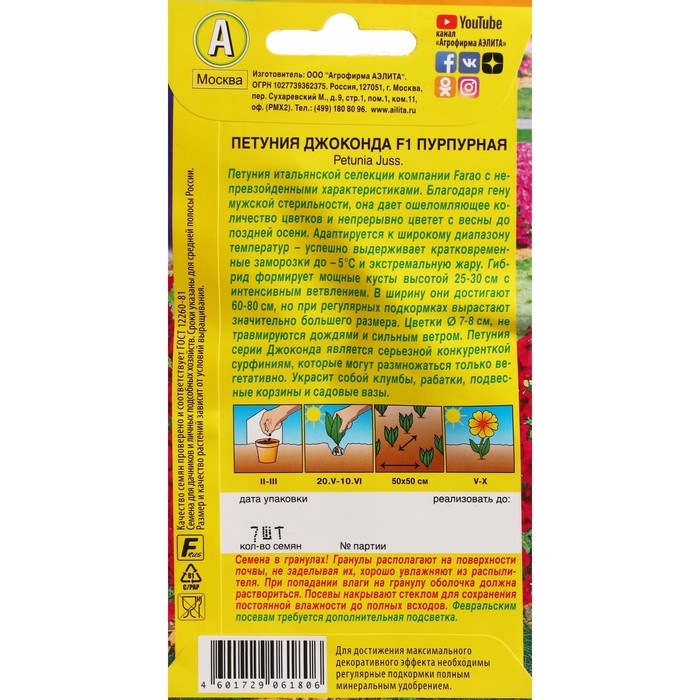 Выращивается через рассаду. Семена в гранулах! Гранулы располагают на поверхности почвы, не заделывая их, хорошо увлажняют из распылителя. При попадании влаги на гранулу оболочка должна раствориться.