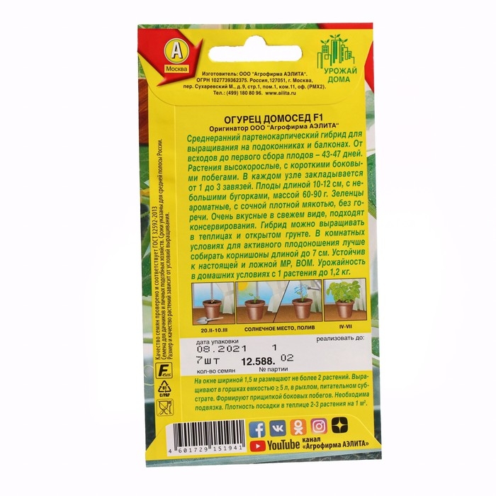Домосед F1 - раннеспелый 100% партенокарпический гибрид с женским типом цветения.При посеве в осенне-зимний период, от всходов до начала плодоношения 56-61 день, в весенне-летний при весеннем посеве 43-45 дней.Плод цилиндрический, с гладкой, глянцевой поверхностью, длиной 14 см, диаметром 3,5-4 см. Генетически свободен от горечи. Предназначен для потребления в свежем виде.Пригодный для комнатной культуры гибрид.Может выращиваться круглый год, как в зимне-весенний, так и в весенний и летне-осенний культурообороты.Вынослив к затенению.Очень красивые и вкусные огурчики.Семена высевают в горшки, объемом 10-15 литров, со специально подготовленной почвой (2 части перегноя, 1 часть дерновой земли, 1 часть песка) на глубину 1,5 см. Температура воздуха и почвы должна быть 20-23°С. Грунт должен быть равномерно увлажнен (не допускается перелив и закисание почвы). После появления всходов, в процессе роста растений, не допускать снижение температуры ниже 14°С. Необходимо опрыскивание теплой водой один раз в день. Во время вегетации необходимы подкормки полным минеральным удобрением с преобладанием азота и содержащие микроэлементы. Прекрасные результаты дает дополнительная подсветка растений в зимнее время. Во время плодоношения необходимо регулярно снимать зеленцы, что стимулирует появление новых завязей.