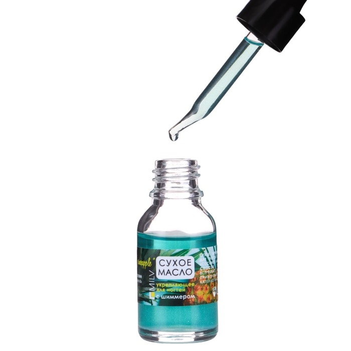 Сухое укрепляющее масло для ногтей с шиммером «COCONUT and PINEAPPLE» приятно наносить на кожу. Лёгкая консистенция обеспечивает быстрое и глубокое впитывание, оставляя на коже бархатистое ощущение. Благодаря специально разработанной формуле масло защищает от сухости, питает, придаёт рукам ухоженный вид, при этом не оставляет липких следов, жирного блеска и ощущения плёнки. Блестящий уход и обогащение: смола мастикового дерева в составе средства повышает прочность ногтей при ежедневном использовании в течение 1 месяца, тропический аромат кокоса и ананаса поднимает настроение, мелкие частицы придают коже мерцающее сияние.