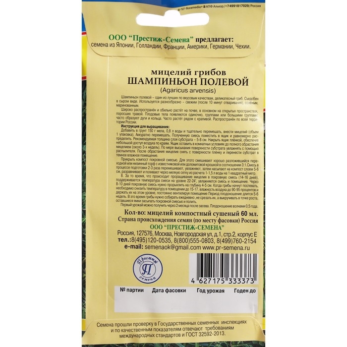 Семена Шампиньон "Бразильский", ц/п, на зерновом субстрате, 15 мл