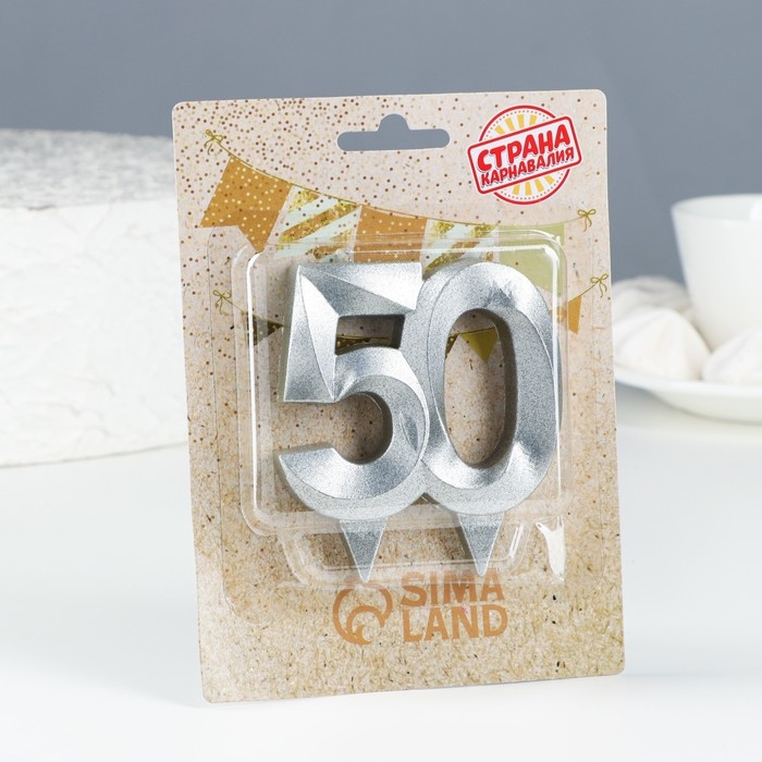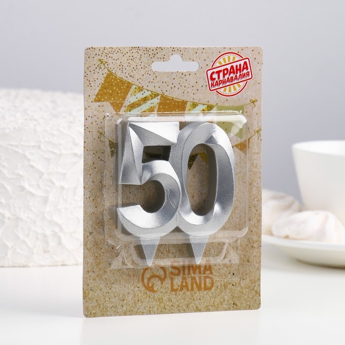 Свеча в торт юбилейная "Грань", цифра 50, серебряный металлик, 6,5 см