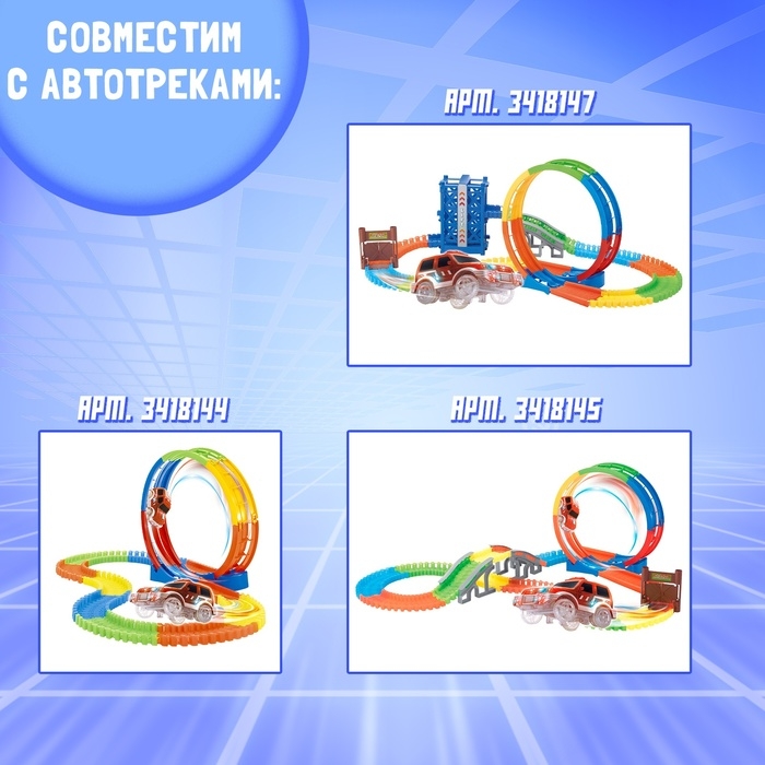 Пришло время эффектных световых шоу — скоростных заездов на гибком треке! Постройте крутую трассу с мостами, спусками, подъемами и мёртвыми петлями и запускайте по ней эту машинку! Ни один юный гонщик не останется равнодушным!