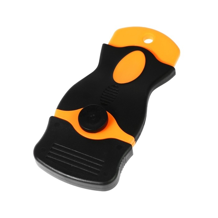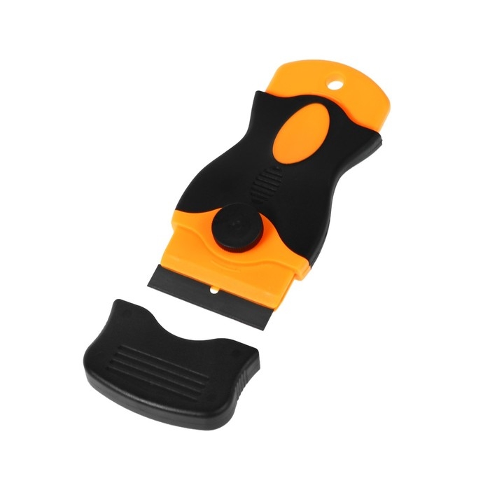 Скребок со сменным лезвием для удаления остатков клея и тонировочной пленки со стекол автомобиля. Может использоваться в бытовых целях для очистки от загрязнений стеклокерамики, варочных панелей и прочих ровных поверхностей.