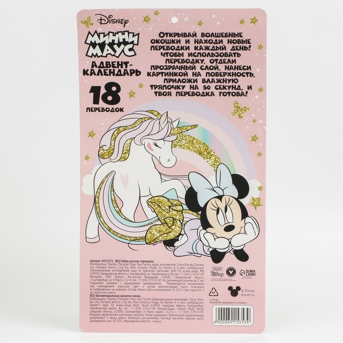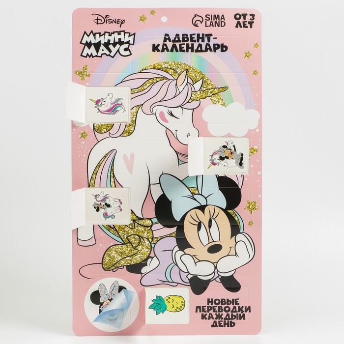 Адвент-календарь «Минни с единорогом», с детскими татуировками — 18 шт., Минни Маус
