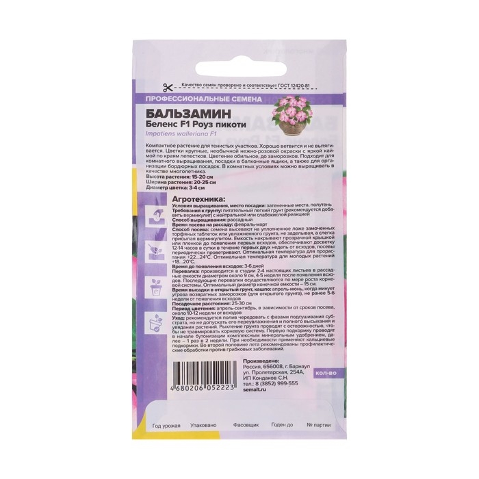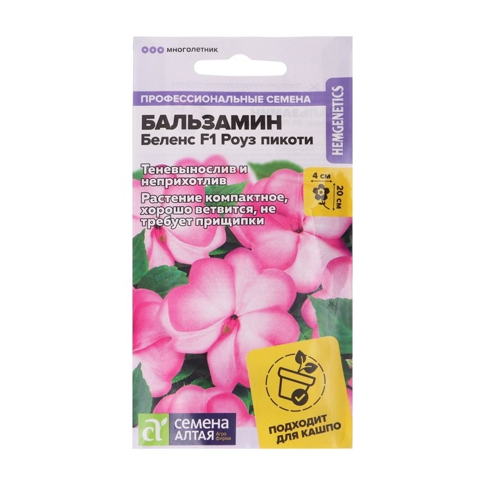 Бальзамин Беленс F1 - многолетнее компактное растение, идеально подходящее для выращивания в горшечной, контейнерной культуре, в открытом грунте выращивается, как летник. Высота растения в горшке 15-20 см, в открытом грунте – 20-25 см. Ширина кустика 25-30 см. На сочных мясистых стеблях расположены удлиненно-эллиптические листья приятной зеленой окраски. Очаровательные простые цветки достаточно крупные, в диаметре 2-3 см. В помещениях цветет весь год при температуре не ниже +16°С. Широко используют для украшения клумб, цветников, рабаток, бордюров, подвесных корзин, контейнеров, вазонов. Растение теплолюбивое, в открытом грунте при наступлении холодных ночей увядает. Предпочитает слегка затененные места в саду или комнате. Не выносит переувлажнения. Посевы на рассаду проводят в конце февраля - марте. Подойдет любая хорошо дренированная почва. Сеют поверхностно, не заделывая - для прорастания семенам нужен свет. Для получения наилучшего результата посев рекомендуем проводить в торфяные таблетки (одно семя в таблетку). Посевы увлажняют, накрывают стеклом (до появления всходов), периодически проветривая, и помещают в светлое место, избегая попадания прямых солнечных лучей. При температуре +23°С всходы появляются через 2-3 недели. После появления первых петелек температуру снижают, днем нужно поддерживать +18°C, а ночью +16°C. На данном этапе рассада нуждается в хорошем освещении, необходимая длина светового дня – не менее 12-14 часов, поэтому растения нужно досвечивать фитолампами. После появления 2-х настоящих листиков сеянцы пикируют в отдельные горшки, обеспечив дренаж. Делают это аккуратно, чтобы не повредить корни растений. В открытый грунт рассаду высаживают в мае-июне, когда минует угроза весенних заморозков, посадочный интервал 25-30 см. Цветение обильное и продолжительное, с июня до осенних холодов.