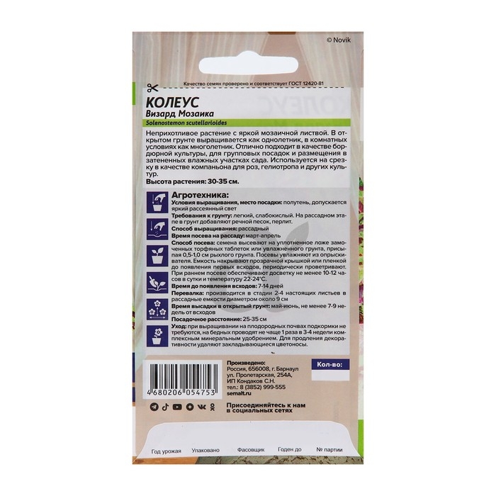 Семена цветов Колеус "Визард", мозаика, Сем. Алт, ц/п, 5 шт