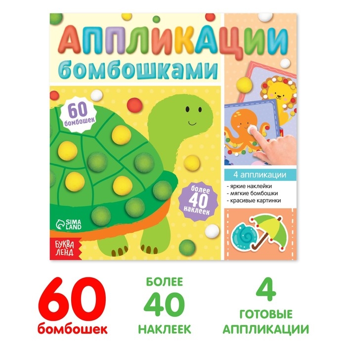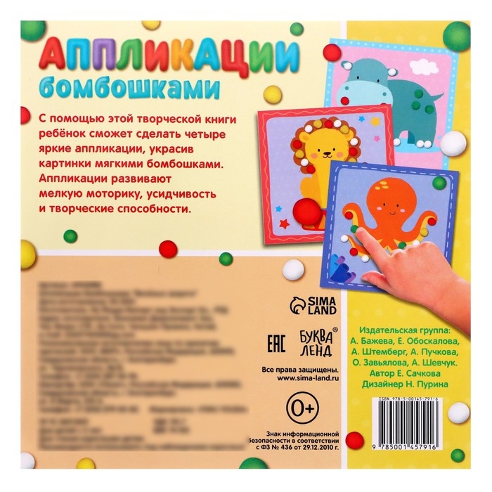 Эта творческая книга поможет малышу создать яркие аппликации. Ребёнок украсит картинки мягкими бомбошками и наклейками. Готовую работу можно вырезать из книги, подписать картинку на обороте и подарить близким.