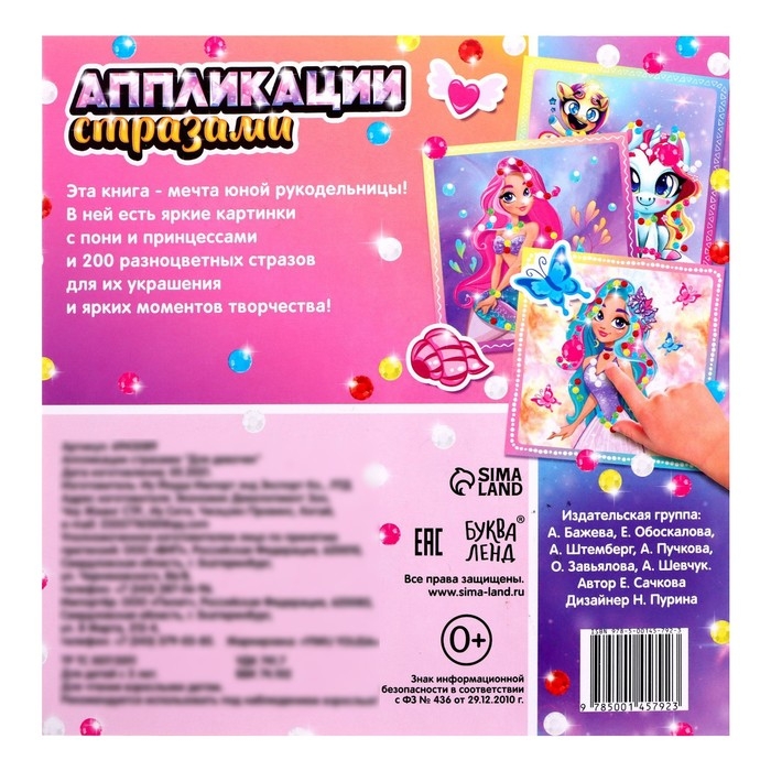 Покажите малышу, как отсоединять кристаллики, и украсьте вместе с ним изображение. В книге 4 ярких картинки, 200 стразов и более 40 наклеек! Занятия с аппликацией благотворно влияют на развитие мелкой моторики и координации движений, тренируют цветовосприятие и эстетический вкус. Полученная картинка украсит детскую комнату или станет презентом для близких.
