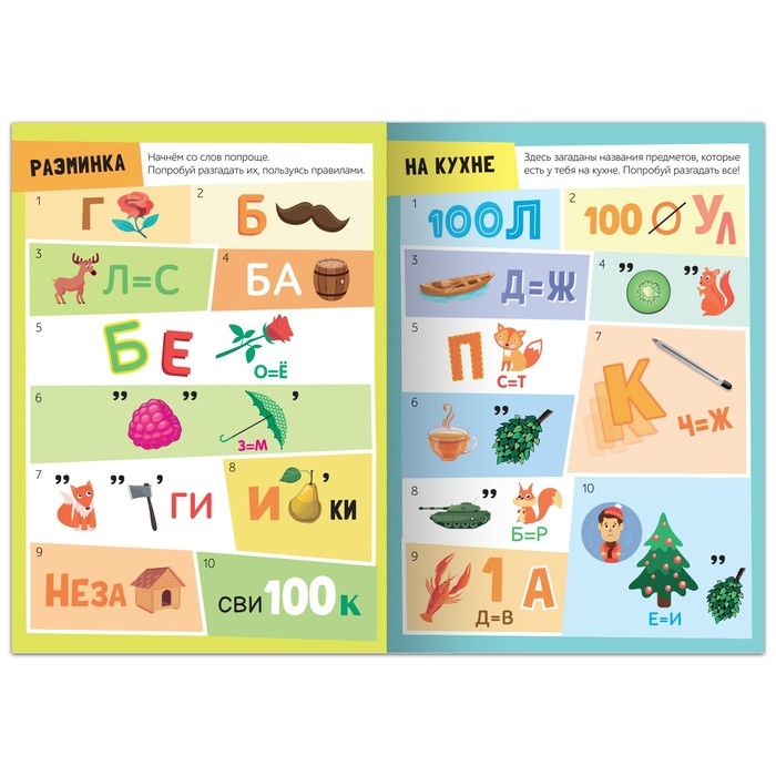 - Внутри вы найдёте ребусы на разные темы: дом, животные, сказки, спорт, транспорт и др.