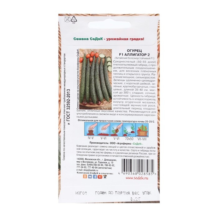 Ценность гибрида: устойчивость к кладоспориозу, вирусу огуречной мозаики, настоящей мучнистой росе, а в длительный период плодоношения, отличные вкусовые качества. Рекомендуется для употребления в свежем виде и консервирования нарезанными дольками. Оптимальная для прорастания семян температура почвы 20-25°С.