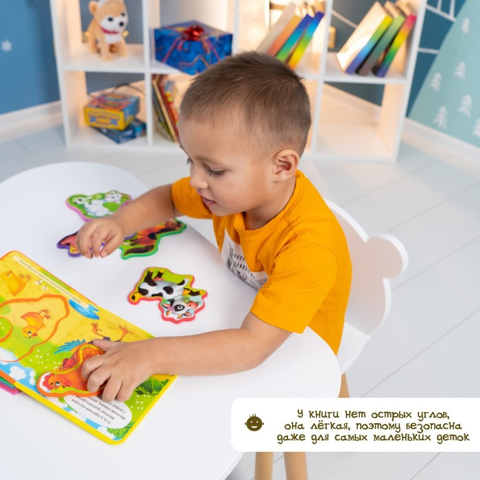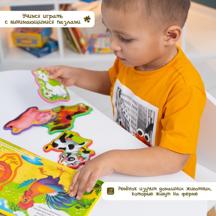 С мягкой книгой малыш получит свои первые знания о домашних животных, которые живут на ферме. А также сможет поиграть с вынимающимися пазлами.