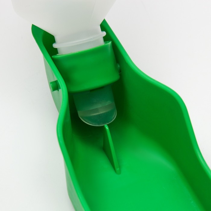 Бутылка для собак проста в использовании. Бутылка для собак откручивается от лотка, наполняется водой, затем снова прикручивается. Далее для поступления необходимого количества воды нужно нажать на бутылку и вода поступит в контейнер для питья собаки. В вертикальном положении поилка не протекает.