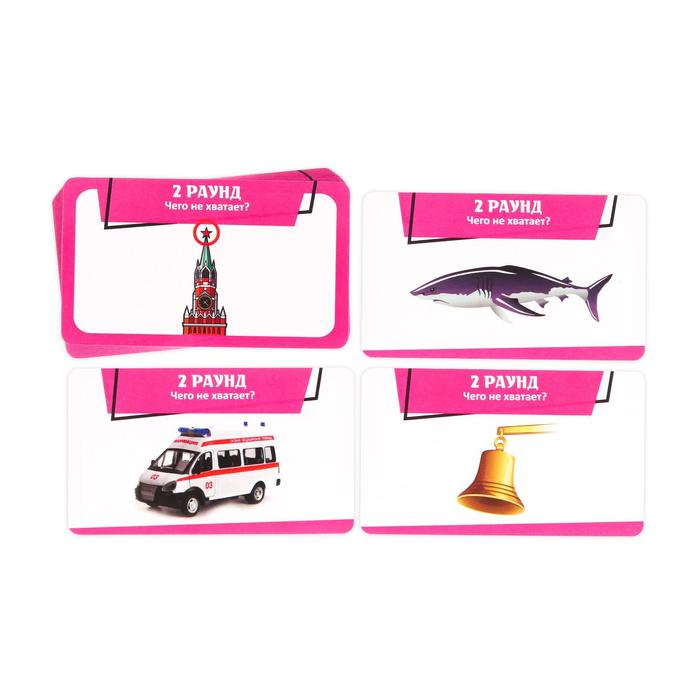 - Чего не хватает? На одной стороне карты находится вопрос и картинка, в которой упущена какая-то деталь. На другой стороне находится цельная картинка. Здесь необходимо внимательно посмотреть на картинку и за 30 секунд сказать, чего на ней не хватает. Подсчитайте количество карточек, полученных за этот раунд. Тот, у кого их больше, считается победителем и получает 1 балл.