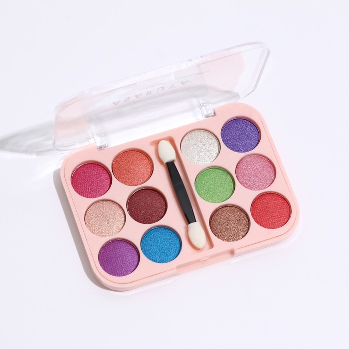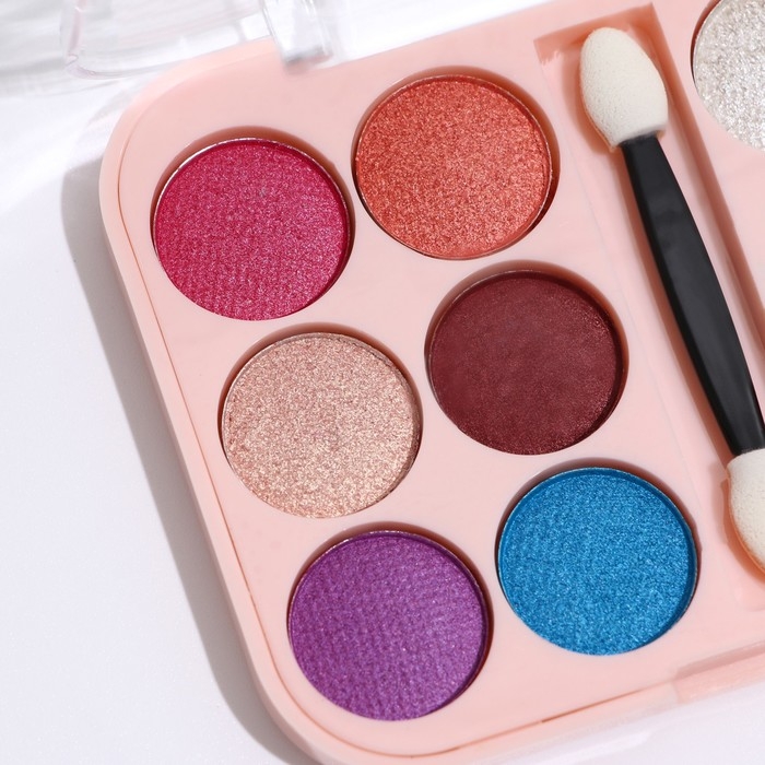 Палетка теней имеет удобную форму и хороший выбор цветов, в том числе блестящих. Тени хорошо пигментированы, не пылят, не скатываются, отлично тушуются и наносятся на веки.