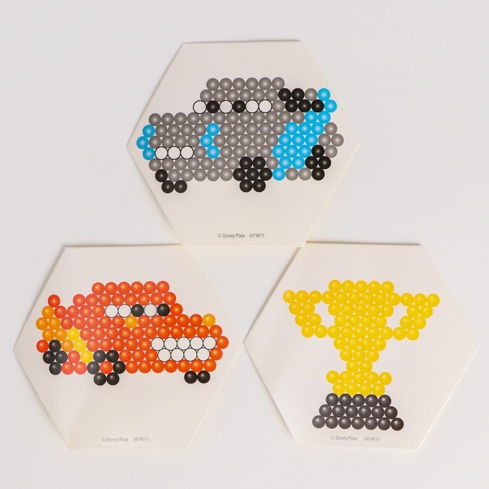 С аквамозаикой с декорациями «Тачки» ребёнок соберёт из шариков-пикселей 3 объёмных фигурки, потренирует мелкую моторику и внимание. С поделками можно играть или украсить интерьер.