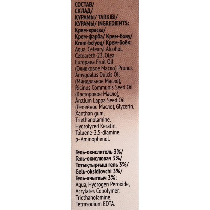 Состав: Крем-окислитель: Aqua, Cetearyl Alcohol, Ceteareth-23, Olea Europaea Fruit Oil (Оливковое Масло), Prunus Amygdalus Dulcis Oil (Миндальное Масло), Ricinus Communis Seed Oil (Касторовое Масло), Arctium Lappa Seed Oil (Репейное Масло), Glycerin, Xanthan gum, Triethanolamine, Hydrolyzed Keratin, Toluene-2,5-diamine, p- Aminofenol. Проявляющая эмульсия 3%: Aqua, Hydrogen Peroxide, Acrylates Copolymer, Triethanolamine, Tetrasodium EDTA.