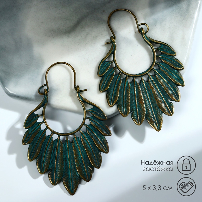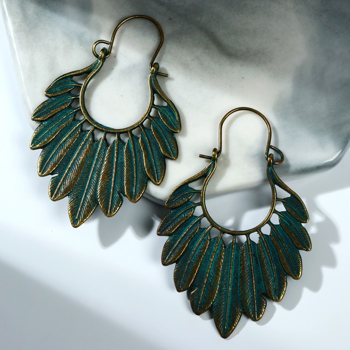 Серьги металл «Восток» перья, цвет зелёно-золотой