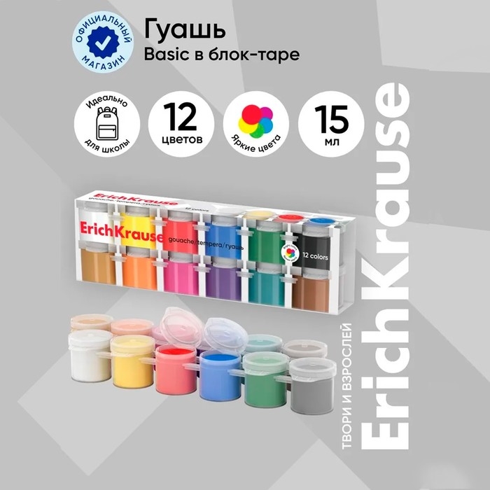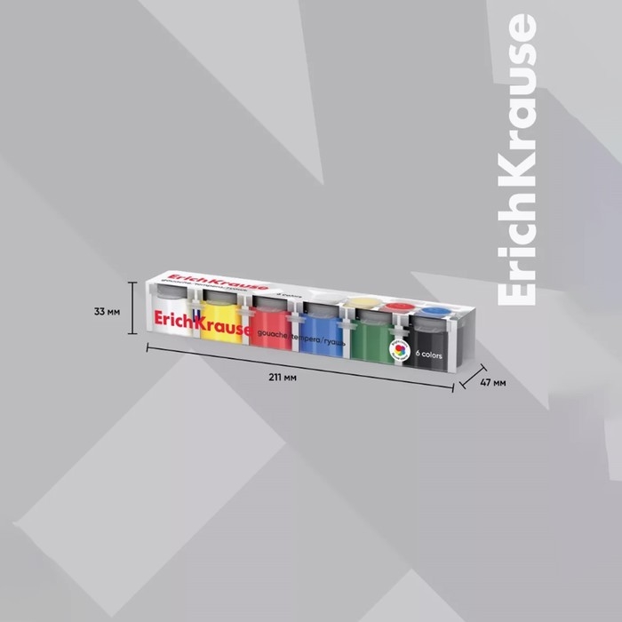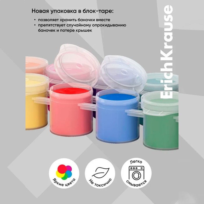 - Безопасная гуашь ErichKrause® на водной основе, легко смывается с рук и отстирывается с большинства видов ткани и бытовых поверхностей, она не токсична, изготавливается из экологичных материалов.