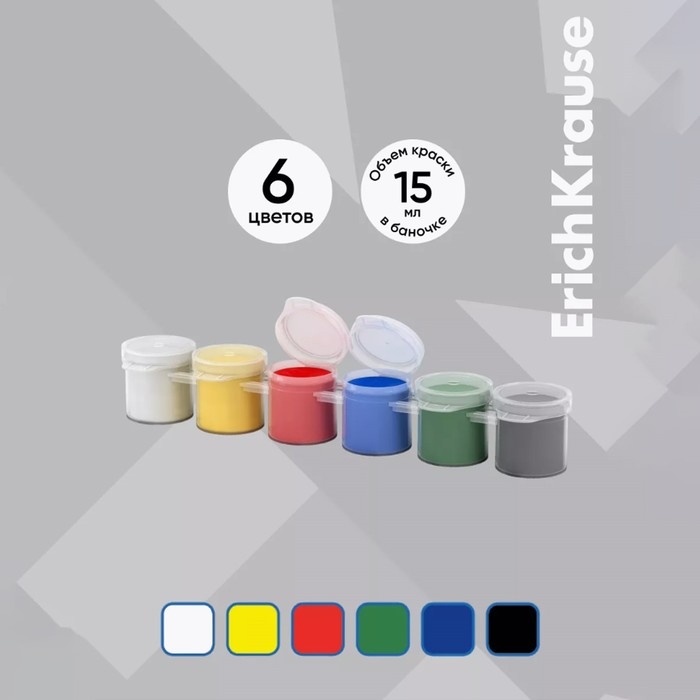 Гуашь 6 цветов х 15 мл, Erich Krause Basic, в эконом упаковке, картонный рукав