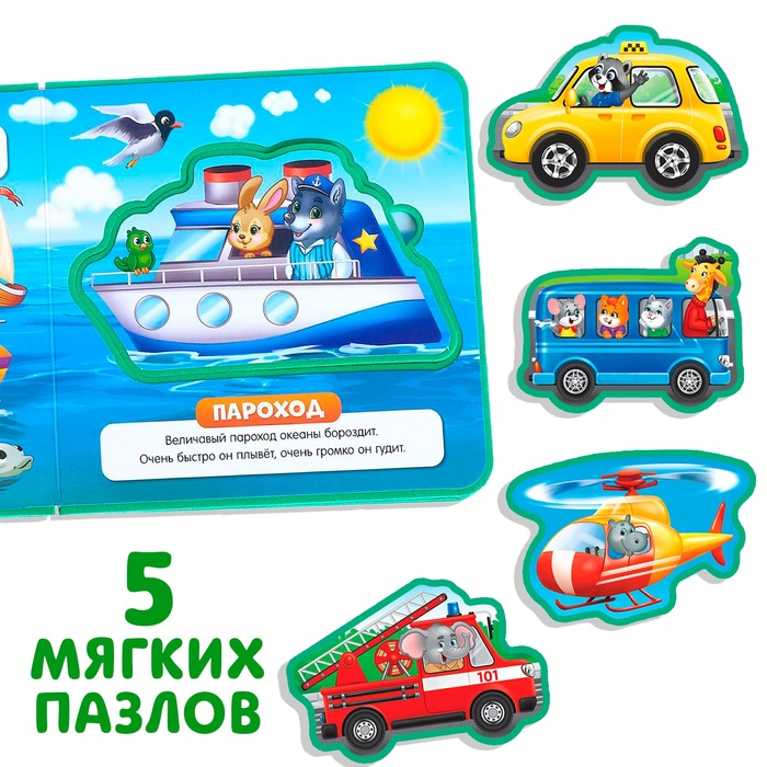 С мягкой книгой малыш узнает о разных видах транспорта, а также сможет поиграть с вынимающимися пазлами.