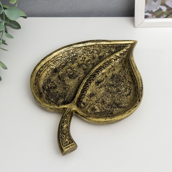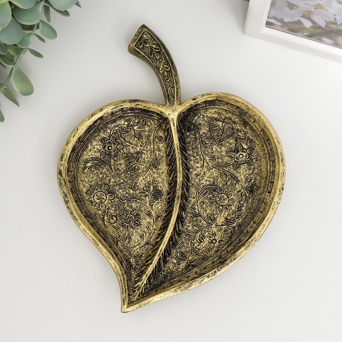 Тарелка декоративная полистоун "Лист с цветочным рисунком" под латунь 4х12х15 см