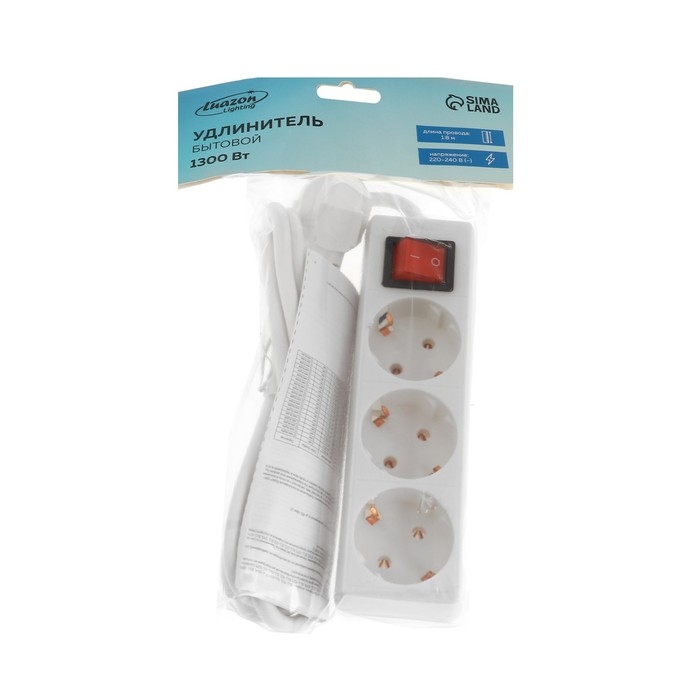 Удлинитель Luazon Lighting, 3 розетки, 1,8 м, 10 А, 2200 Вт, 3х0.75 мм2, с з/к, с выкл., Б
