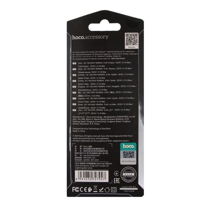 Сетевое зарядное устройство Hoco C81A, USB - 2.1 А, кабель Lightning 1 м, белый