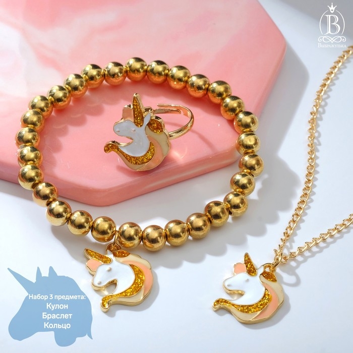 Набор детский 3 предмета: кулон, браслет, кольцо «Выбражулька» единороги, цветной в золоте
