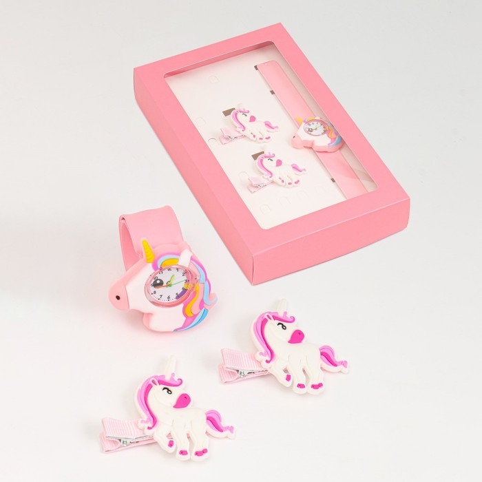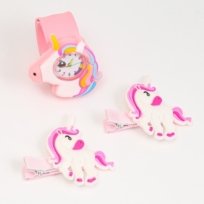 Детский подарочный набор для девочек "Единороги" 3 в 1: наручные часы, 2 невидимки