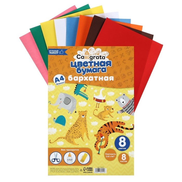 Набор бумаги бархатной А4, 8 листов, 8 цветов, плотность 110г/м2
