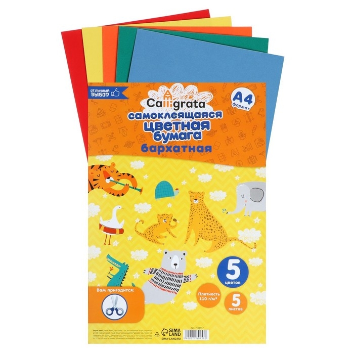 Набор бумаги бархатной САМОКЛЕЮЩЕЙСЯ А4, 5 листов, 5 цветов, плотность 110г/м2