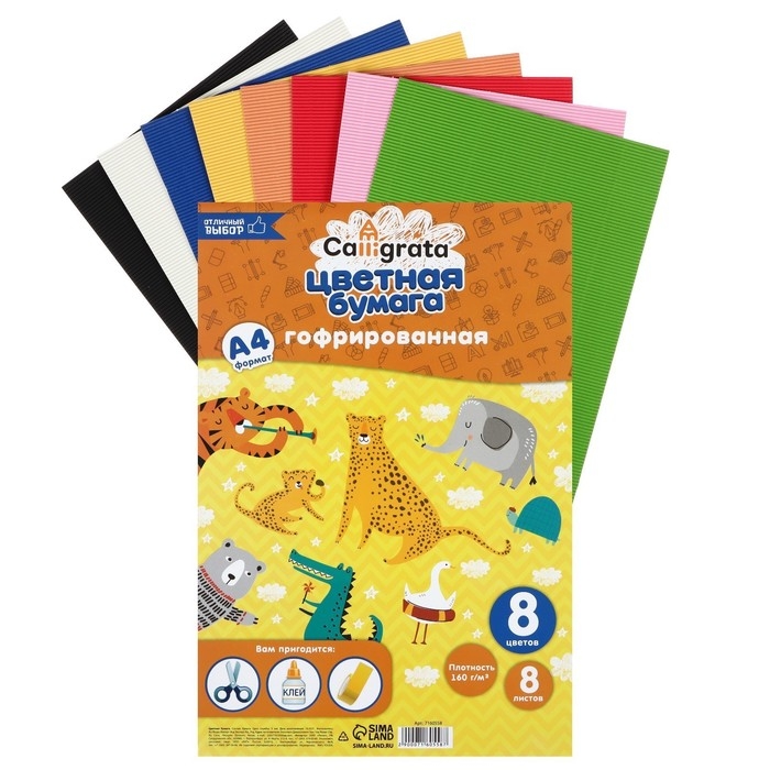 Набор бумаги гофрированной А4, 8 листов, 8 цветов, плотность 160 г/м2
