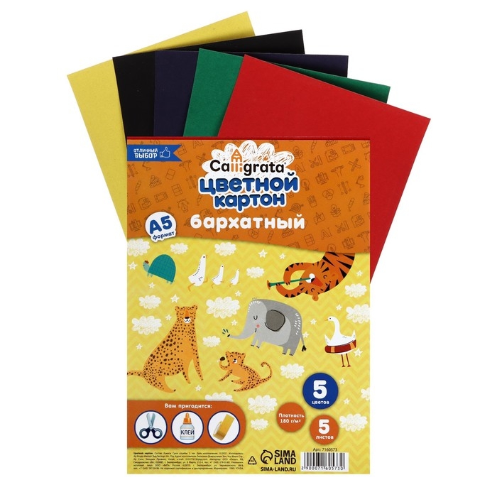 Картон бархатный А5, 5 листов, 5 цветов, 180 г/м2