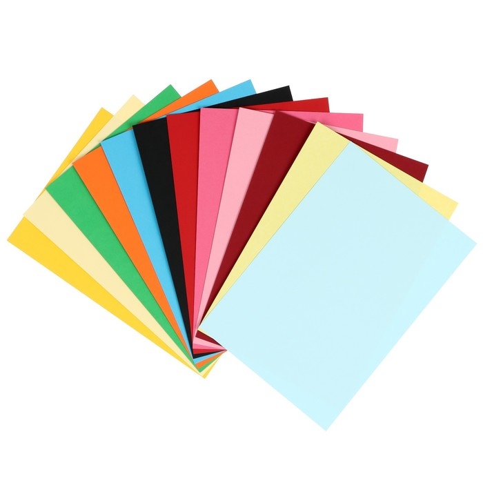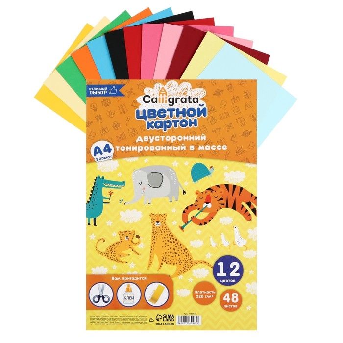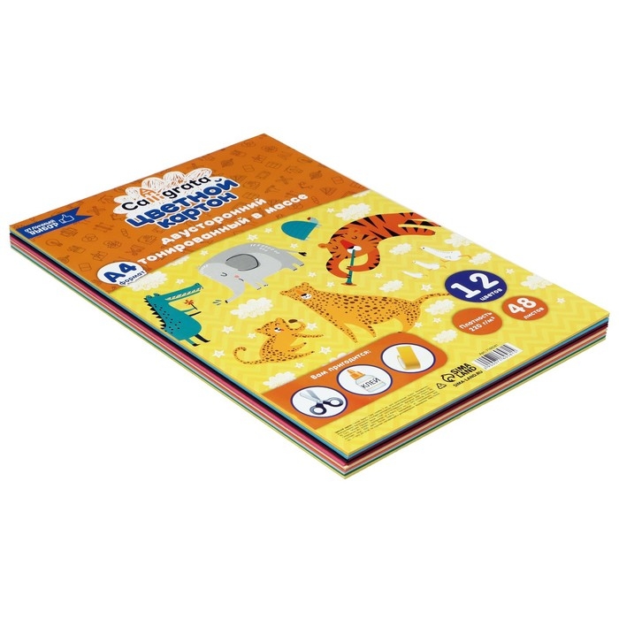 Картон цветной двусторонний А4, тонированный в массе, 48 листов, 12 цветов, 220 г/м2