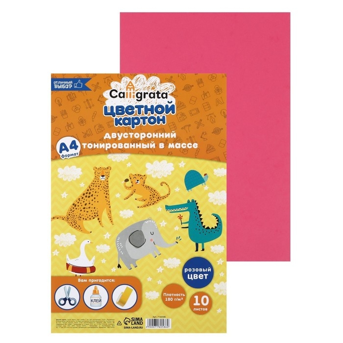 Картон цветной двусторонний А4, тонированный в массе, 10 листов, 180 г/м2, розовый