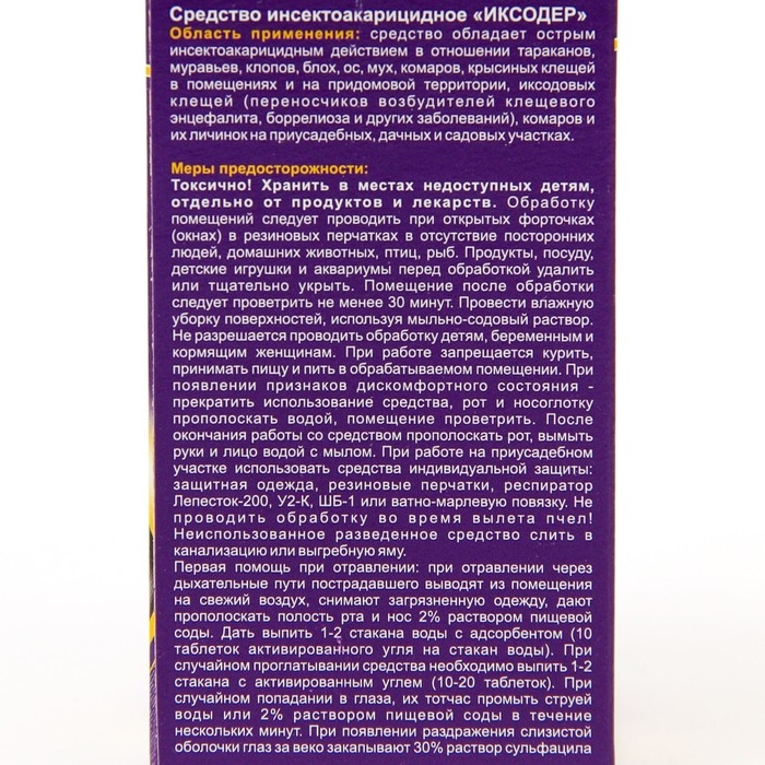 Предназначено для уничтожения тараканов, клопов, мух, блох, муравьев, комаров, крысиных клещей, а также лесных и таежных клещей – переносчиков возбудителей клещевого энцефалита и клещевого боррелиоза.
