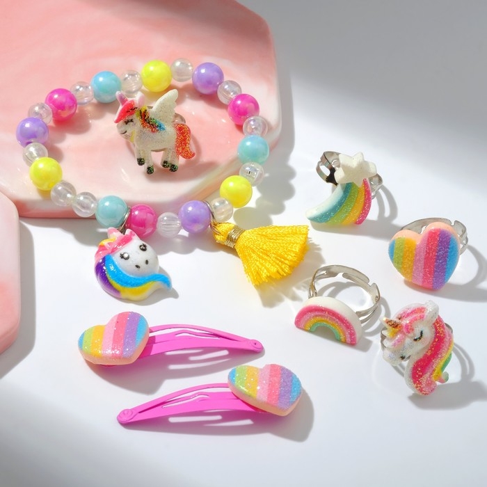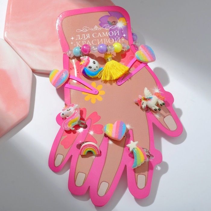 Комплект детский «Выбражулька» 8 предметов: 2 заколки, браслет, 5 колец, форма МИКС, цветной